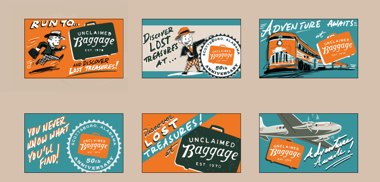 Ongoing work with Unclaimed Baggage has included everything from photo opportunities with a vintage truck and stack of suitcase (evoking their unique story) to highway billboards, placemaking and way finding, and ongoing design work.